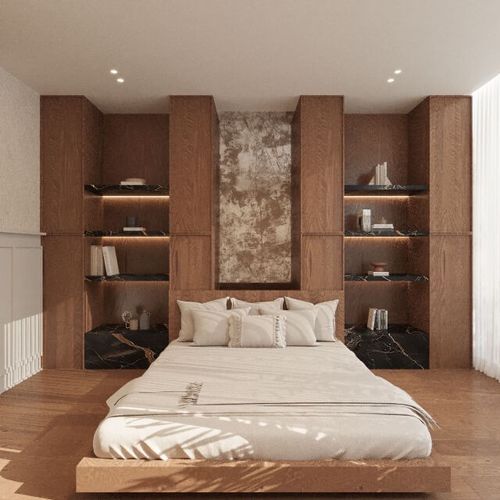 With a love for rich natural materials and textures, the client requested a space that is multifunctional and beautiful. Each of the bedrooms are to function as a bedroom and office or seating area. Murphy beds were designed to disappear in feature walls that allow the room to transform immediately. Natural pastel tones and stone effect tiles are combined with the rich color and texture of the wood.